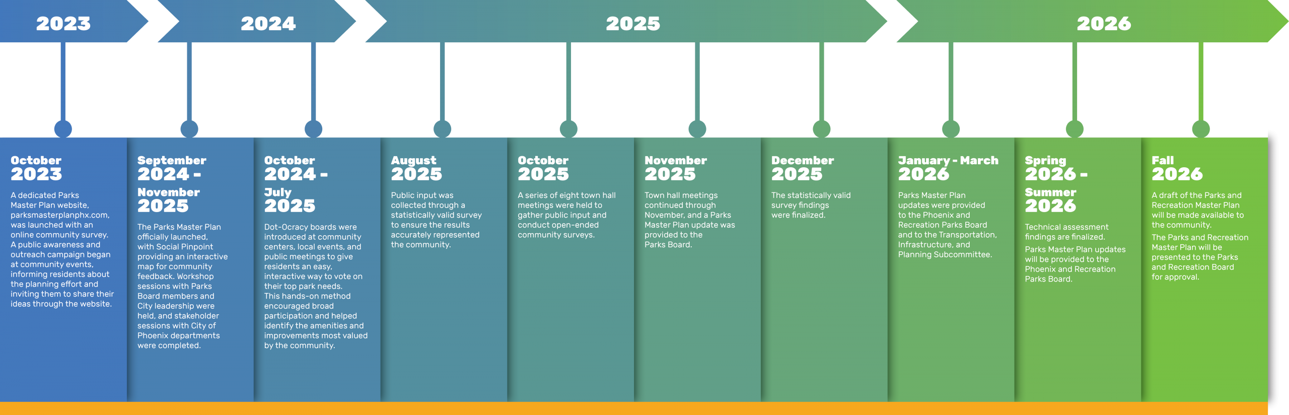 The Phoenix Parks and Recreation Department is developing a Master Plan to define the community’s vision and guide the department’s direction for the next ten years and beyond. With the substantial growth and change in the community over the years, an updated Master Plan is essential for the future of Phoenix and its 1.7 million residents.